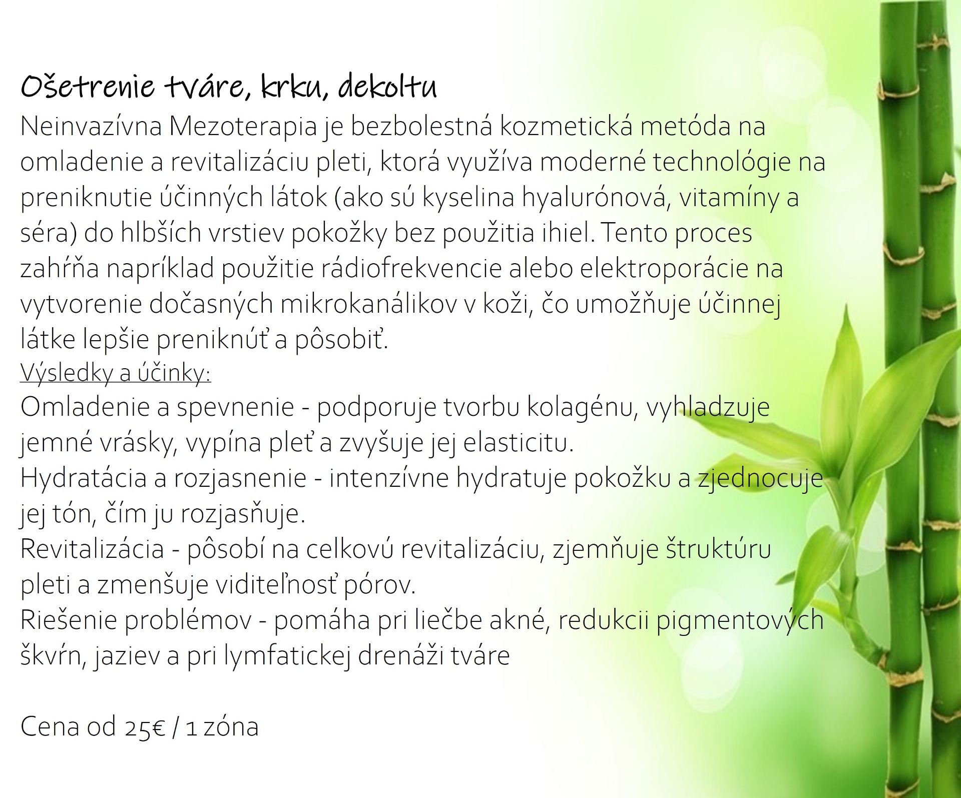 - ošetrenie tváre a krku - bezihlový neinvazívny lifting - mezoterapia (redukcia akné, pigmentových škvŕn, jaziev, vrások)