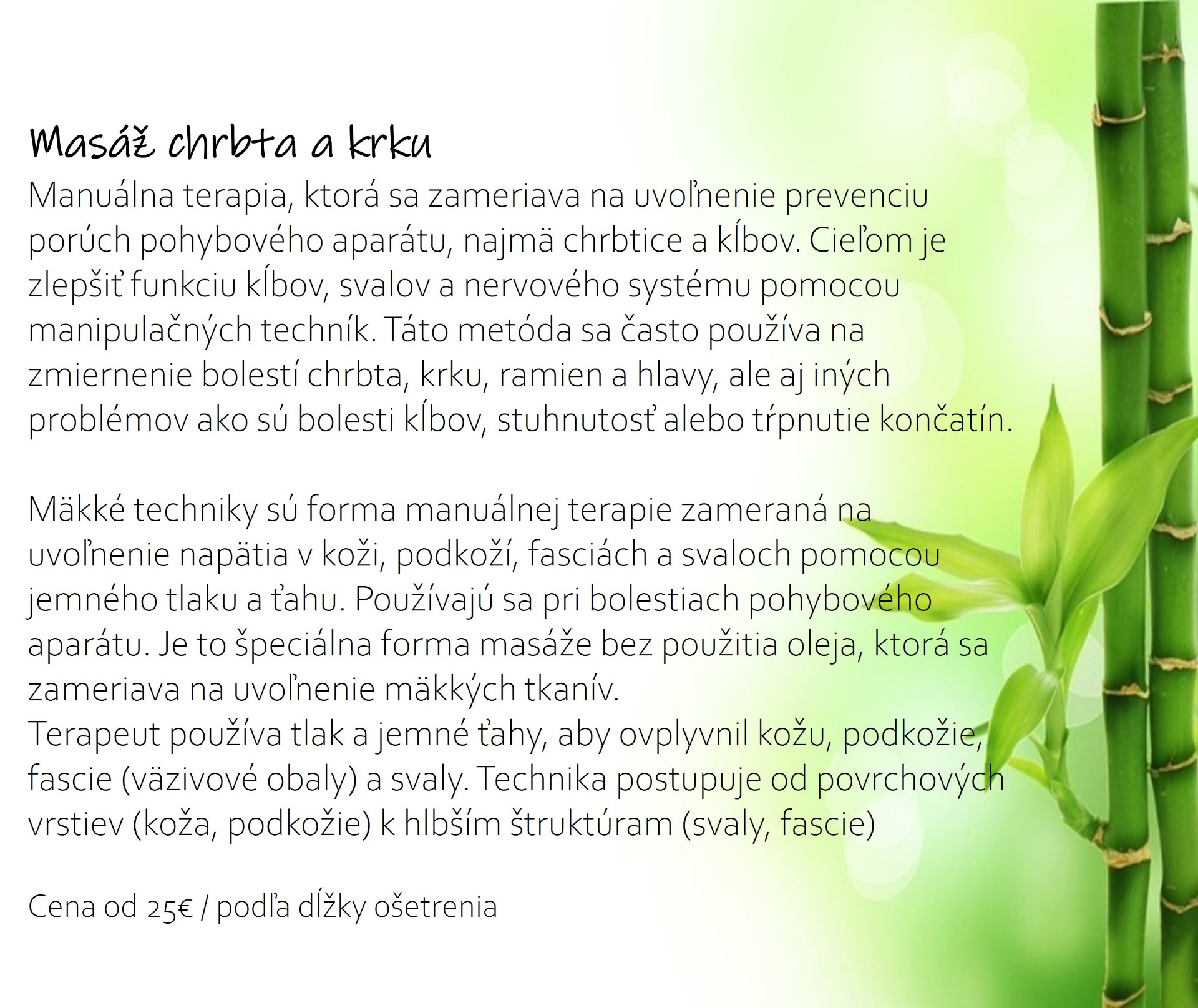 - uvoľnenie blokád pohybového aparátu, mäkké techniky, chiropraxia, masáž chrbta a krku