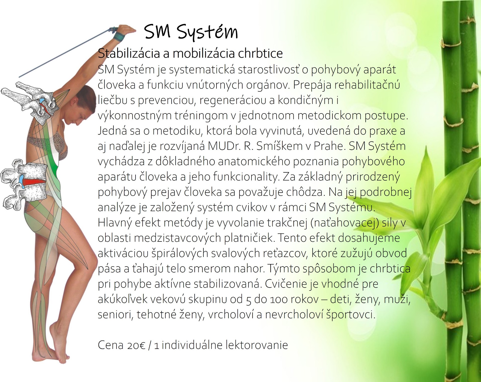 - SM systém - cvičenie zamerané na stabilizáciu a mobilizáciu pohybového aparátu. Individuálny prístup